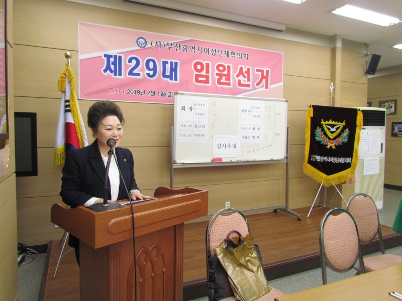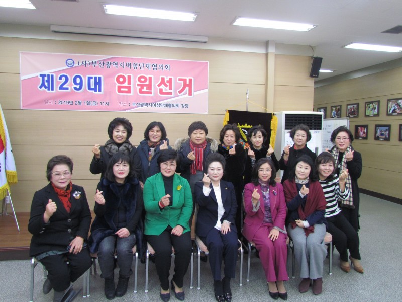 : (사)부산광역여성단체협의회는 2월1일(금)오전11시 부산광역시 여성단체협의회 강당에서 『제29대 임원선거』 를 윤교숙 선거관리위원장을 비롯하여 최경옥, 장다겸 선거관리위원 및 이사15명이 참석한 가운데 회장1명, 부회장2명, 감사2명을 각각 선출 했습니다.
