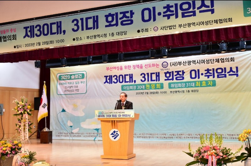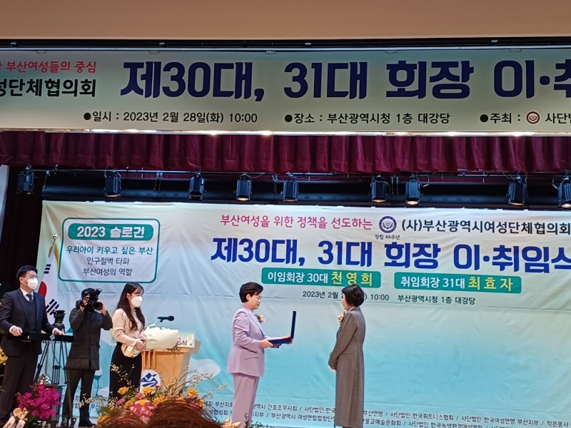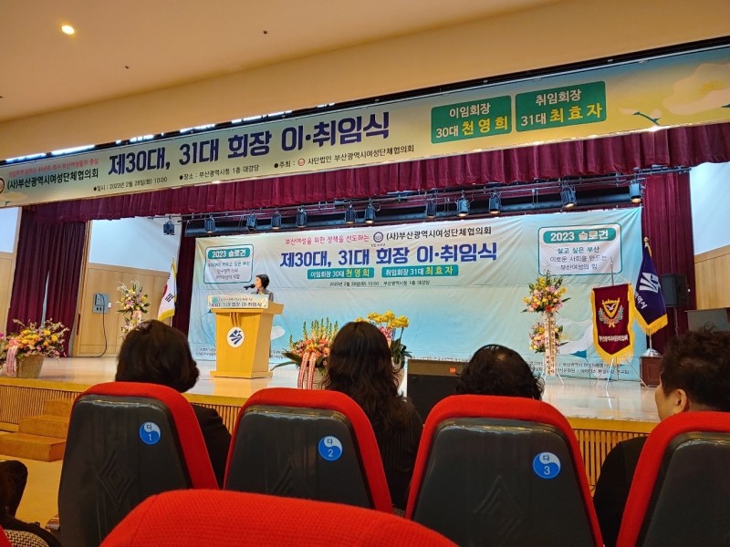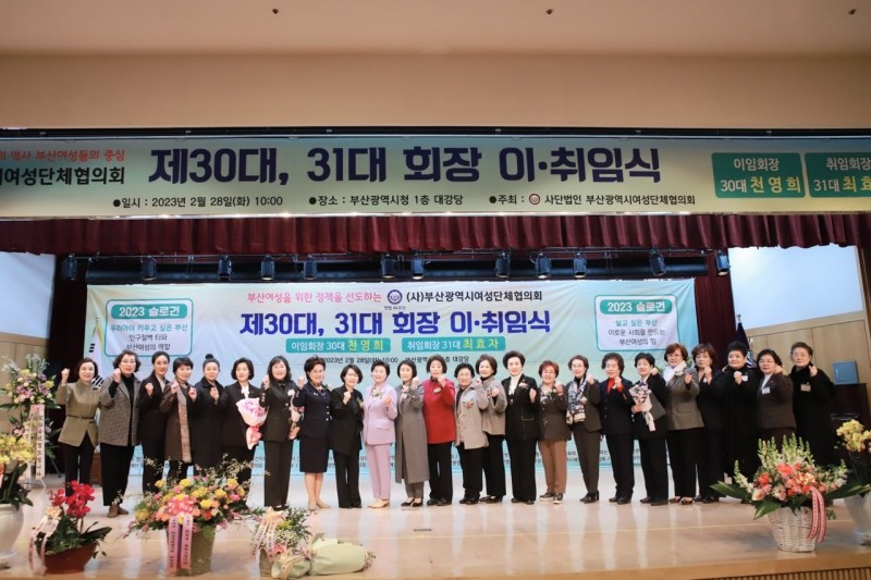 (사)부산광역시여성단체협의회는 2월 28일 오전 10시, 회원단체 및 여성 지도자 각급 기관장, 기업체 대표 등 주요 내·외빈 350여 명이 참석한 가운데 부산광역시청 1층 대강당에서 '제30대, 31대 회장 이·취임식'을 개최했다.