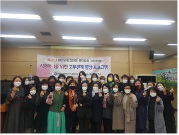 2021년 시어머니를 위한 고부관계 향상 프로그램 페이지 정보 작성자 최고관리자 작성일21-12-19 17:58 조회2,369회 관련링크 이전글 다음글 목록 본문 행사명 : 2021년 시어머니를 위한 고부관계 향상 프로그램일시 : 2021년 11월 1일 월요일장소 : 부산여협 강당 이전글 다음글 목록