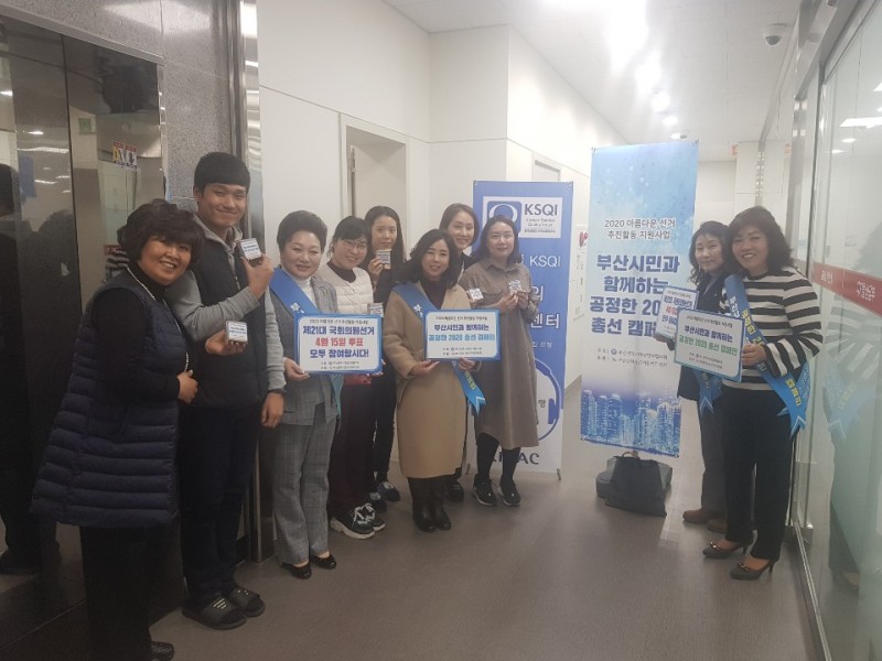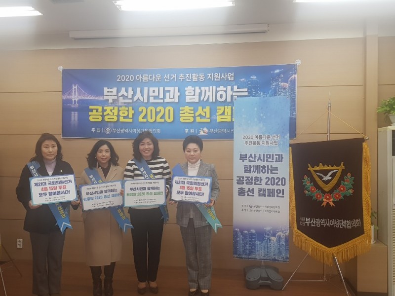 부산 시민과 함께하는 공정한 2020 총선 캠페인 페이지 정보 작성자 최고관리자 작성일20-03-06 14:41 조회2,987회 관련링크 이전글 다음글 목록 본문 국민의 정치적 관심이 높은 이때 시민들과 함께 참여하고 화합하는 공정선거 캠페인을 통해 시민들의 적극적인 정치참여를 견인하여, 선거제도와 정당정치의 한계를 넘어 바람직한 선거문화를 구축하고, 민주 시민의식 함양과 민주정치를 정착시키는 데 기여함을 목적으로 한다. *행사명: 공정한 2020 총선 캠페인*일시: 2020.02.21(금)*장소; 부산은행*주최: (사)부산광역시 여성단체협의회 이전글 다음글 목록