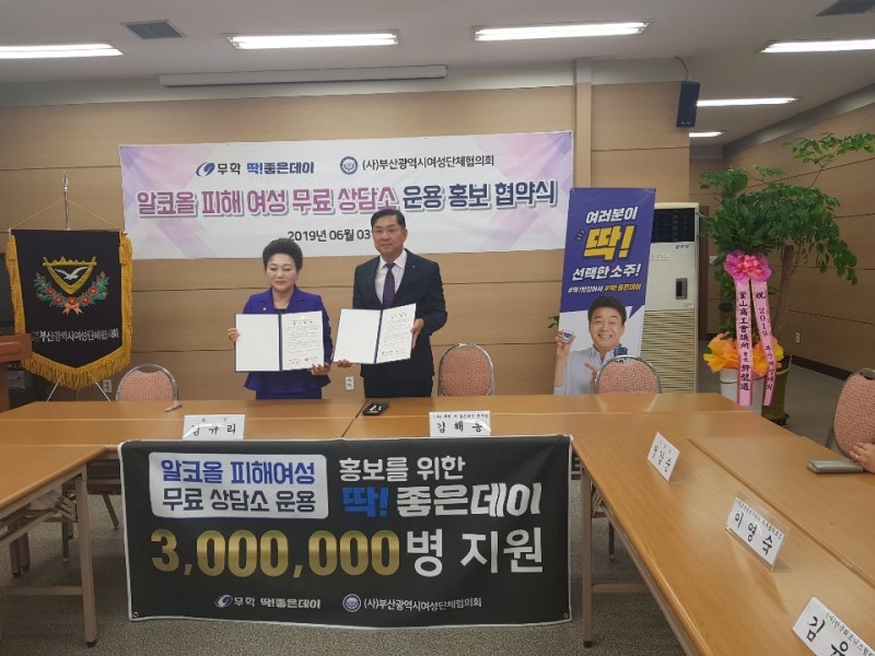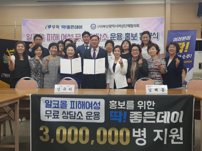 부산광역시 여성단체협의회와 (주)무학 좋은데이는 알코올 피해 여성을 위한 상담소 운영 관련 홍보를 지원하는 내용의 업무협약(MOU)을 체결했다