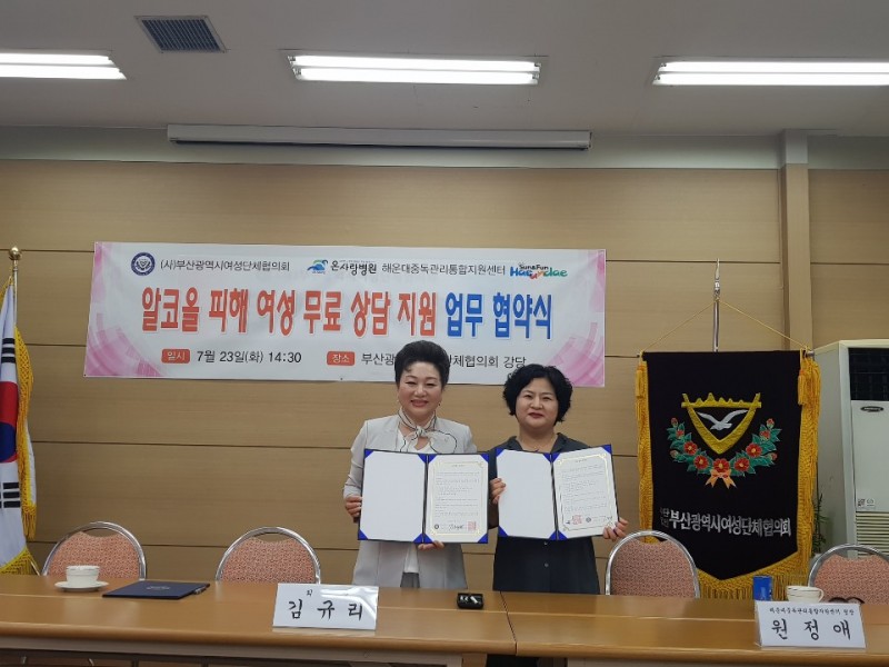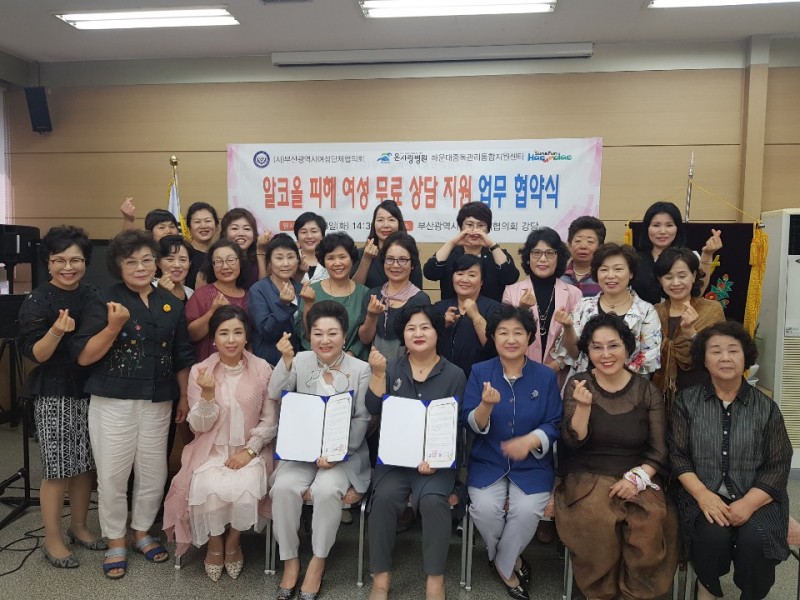 알코올 피해 여성 무료 상담 지원 업무 협약식 페이지 정보 작성자 최고관리자 작성일19-07-23 17:48 조회2,977회 관련링크 이전글 다음글 목록 본문 ◉ 행 사 명 : 알코올 피해 여성 무료 상담 지원 업무 협약식◉ 일 시 : 2019년 7월 23일(화)◉ 장 소 : 부산광역시 여성단체협의회◉ 주 최 : (사)부산광역시여성단체협의회, 온사랑병원, 해운대중독관리통합지원센터‘여성들이 알코올 중독 없는 사회 행복한 부산 만들기’라는 슬로건으로 부산 시민의 행복한 삶을 위해 소중한 가치를 실현하고자 부산광역시여성단체협의회에서 무료상담 전화를 개설하여 시민들의 건강생활 실천의지와 건강관리 능력을 함양 시키고 건강생활습관에 대한 이해와 관심을 증진시키고자 한다. 이전글 다음글 목록