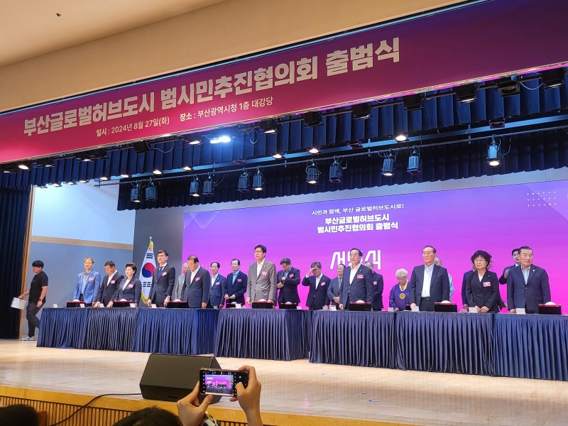 2024년 8월 27일 부산글로벌허브도시 범시민추진협의회 출범식 페이지 정보 작성자 최고관리자 작성일24-08-28 11:45 조회1,254회 관련링크 이전글 다음글 목록 본문 2024년 8월 27일 (화) 부산시청 1층 대강당에서 부산글로벌허브도시 범시민추진협의회 출범식이 있었습니다. 부산광역시장, 부산광역시의회희장, 범시민 추진협의외 임원 및 위원등 700여명이 참석한 이 행사에서는 임원 소개, 인사말씀·축사, 활동계획 발표, 결의문 낭독과 서명식 및 퍼포먼스등이 진행되었습니다. 최효자 회장 외 여협 회원 70여명이 행사에 참여하여 자리를 빛냈습니다. (행사 식순) 이전글 다음글 목록