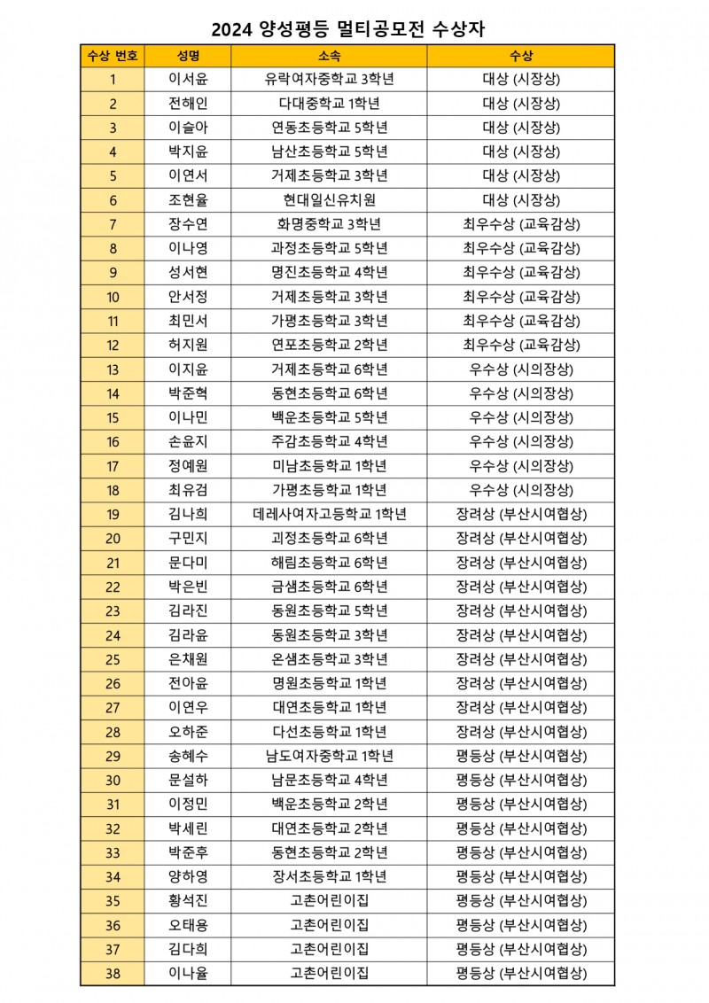 (종료) 2024 양성평등 멀티공모전 수상자 발표 페이지 정보 작성자 최고관리자 작성일24-08-26 12:06 조회2,621회 관련링크 이전글 다음글 목록 본문 2024년 양성평등 멀티공모전에 많은 참여해주셔서 감사합니다. 수상자는 아래와 같습니다. 감사합니다. 이전글 다음글 목록