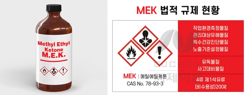 기존에 업체에서 사용한 MEK(메틸에틸케톤)는 산업안전보건법에 작업환경측정물질, 관리대상유해물질, 특수건강진단물질, 노출기준설정물질에 해당되면 화학물질관리법에 유독물질, 사고대비물질에 해당되는 물질로 특별히 많은 관리가 필요한 화학물질입니다.