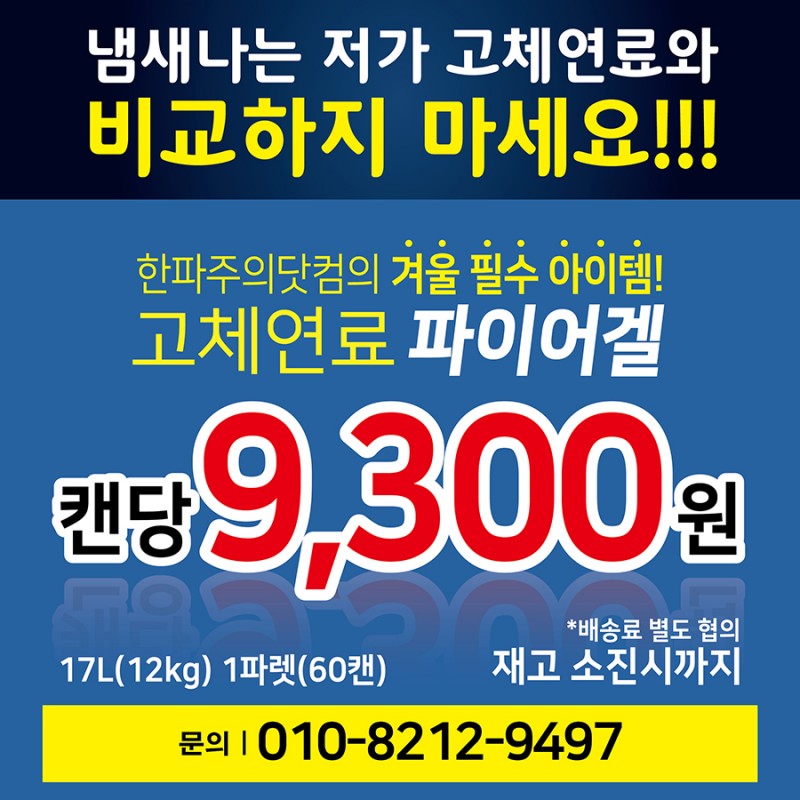 (한파주의닷컴) 고체연료 파이어겔 젤타입 캔당 9,300원 판매 페이지 정보 작성자 씨제이켐 작성일19-02-12 09:25 조회6,789회 관련링크 이전글 다음글 목록 본문 (한파주의닷컴) 고체연료 파이어겔 젤타입 캔당 9,300원 판매건설현장 콘크리트양생용 / 갈탄대체, 화목난로대체 이전글 다음글 목록