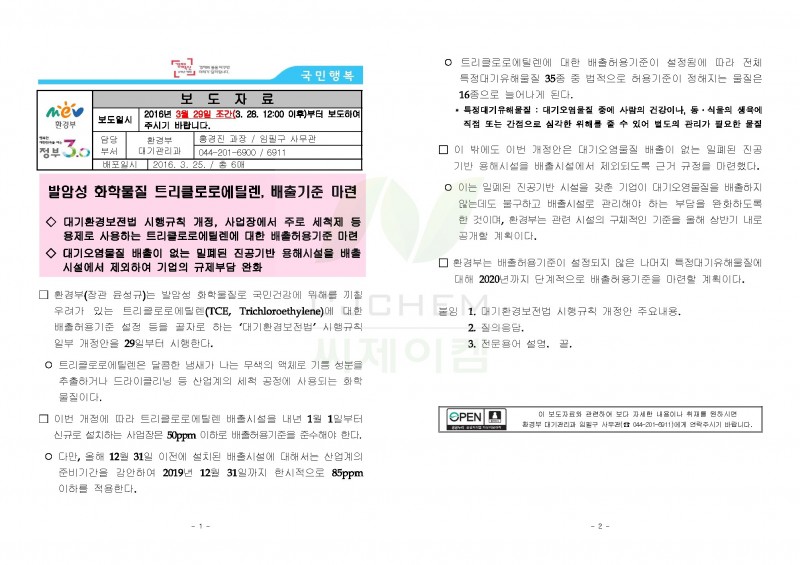 환경부(장관 윤성규)는 발암성 화학물질로 국민건강에 위해를 끼칠 우려가 있는 트리클로로에틸렌(TCE, Trichloroethylene)에 대한 배출허용기준 설정 등을 골자로 하는 ‘대기환경보전법’ 시행규칙 일부 개정안을 29일부터 시행한다.