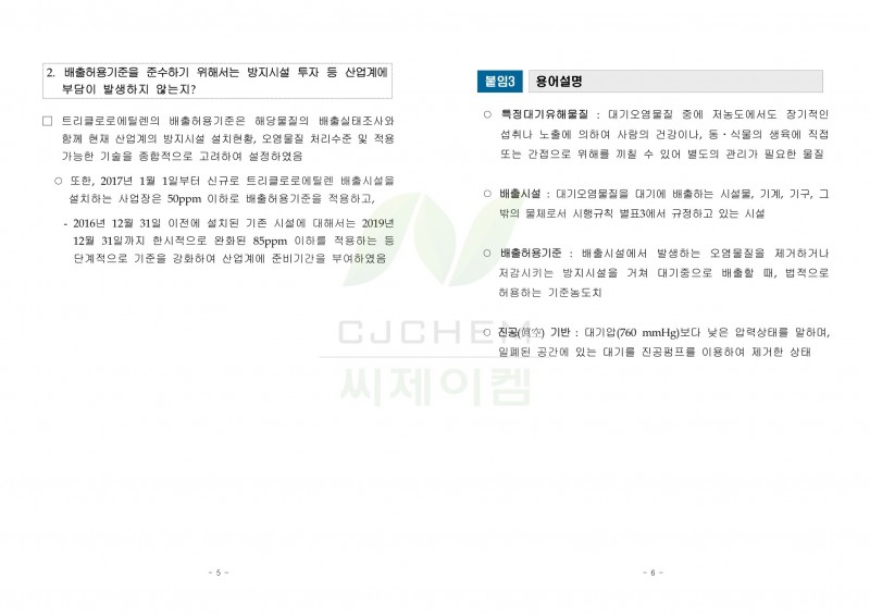 이번 개정에 따라 트리클로로에틸렌 배출시설을 내년 1월 1일부터 신규로 설치하는 사업장은 50ppm 이하로 배출허용기준을 준수해야 한다. 다만, 올해 12월 31일 이전에 설치된 배출시설에 대해서는 산업계의 준비기간을 감안하여 2019년 12월 31일까지 한시적으로 85ppm 이하를 적용한다.