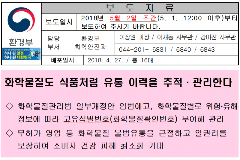 환경부(장관 김은경)는 '화학물질 이력추적관리제도' 도입을 주요 내용으로 하는 '화학물질관리법(이하 화관법)' 일부 개정법률안을 5월 3일부터 입법예고한다고 밝혔다.