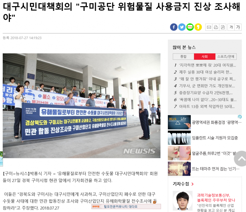 대구시민대책회의 " 구미공단 위험물질 사용금지 진상 조사해야" 페이지 정보 작성자 씨제이켐 작성일18-07-30 18:47 조회7,715회 관련링크 이전글 다음글 목록 본문 유해물질로부터 안전한 수돗물 대구시민대책회의 회원들이 27일 경북도와 구미시는 대구 시민에게 사과하고 , 구미산업단지 폐수로 인한 대구 수돗물 사태에 대한 민관 합동 진상 조사와 구미 산업단지 유해화학물질 전수 조사에 동참하라"고 주장했다 2018. 07. 27 이전글 다음글 목록