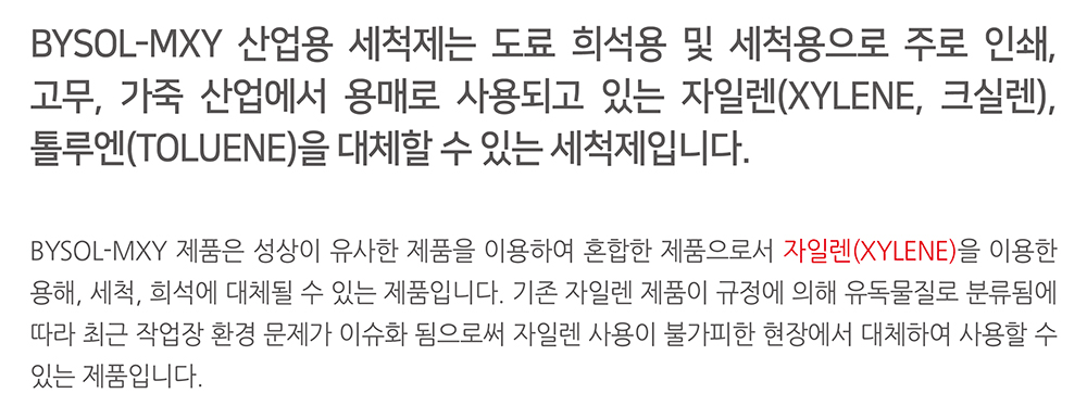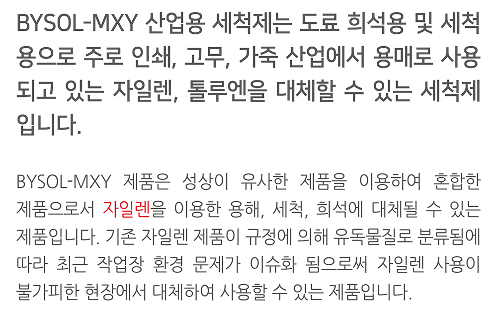 BYSOL-MXY는 유독물질에 분류되지 않지만 기존 유기용제의 위험성은 갖고 있음으로 당사에서 제공하는 물질안전보건자료(MSDS)에 근거하여 취급하시기 바랍니다.