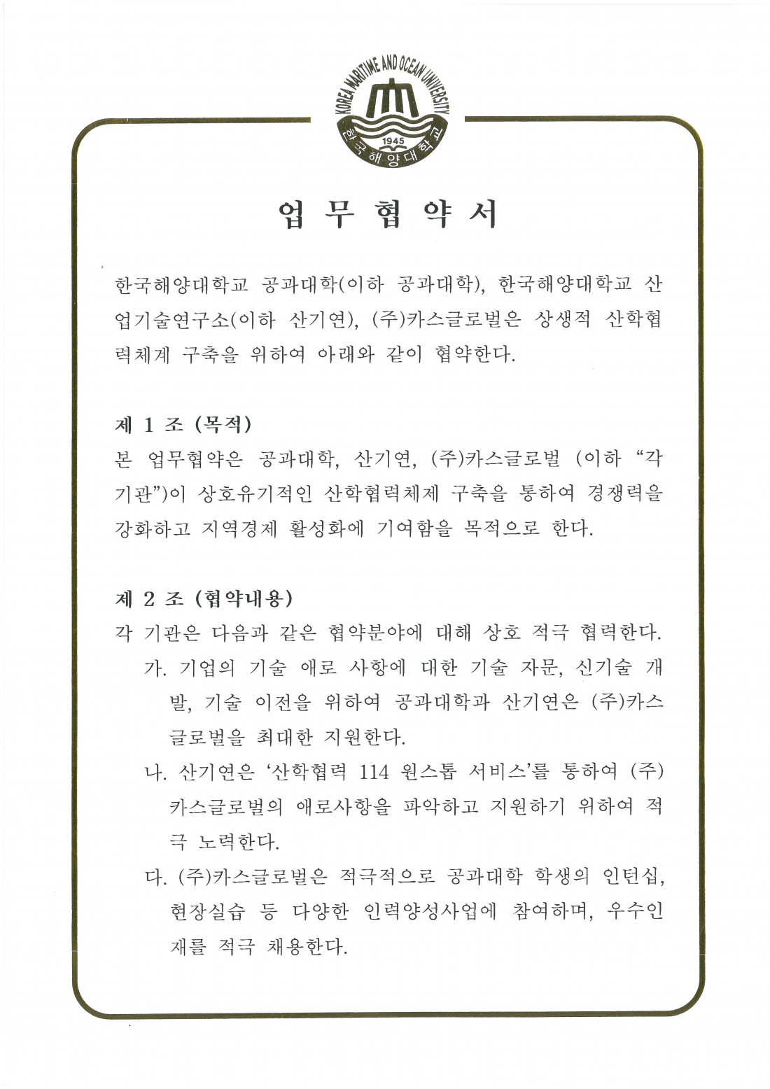 인증서 | 해양대학교 업무협약서 (1)