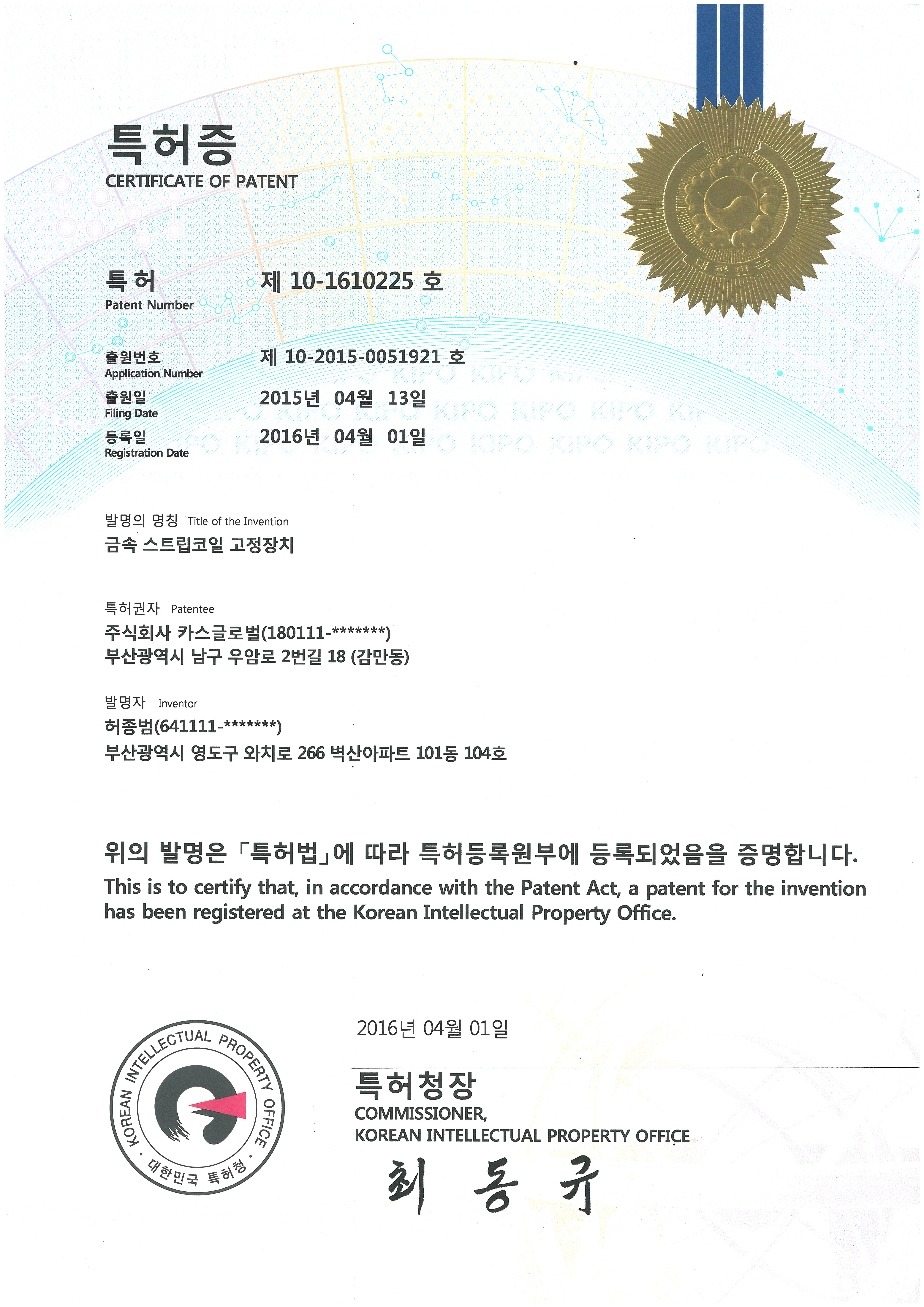 특허 | 금속 스트립코일 고정장치 (특허증) 페이지 정보 작성자 최고관리자 작성일17-12-05 14:48 조회2,705회 댓글0건 이전글 다음글 목록 본문 금속 스트립코일 고정장치 (특허증) 이전글 다음글 목록