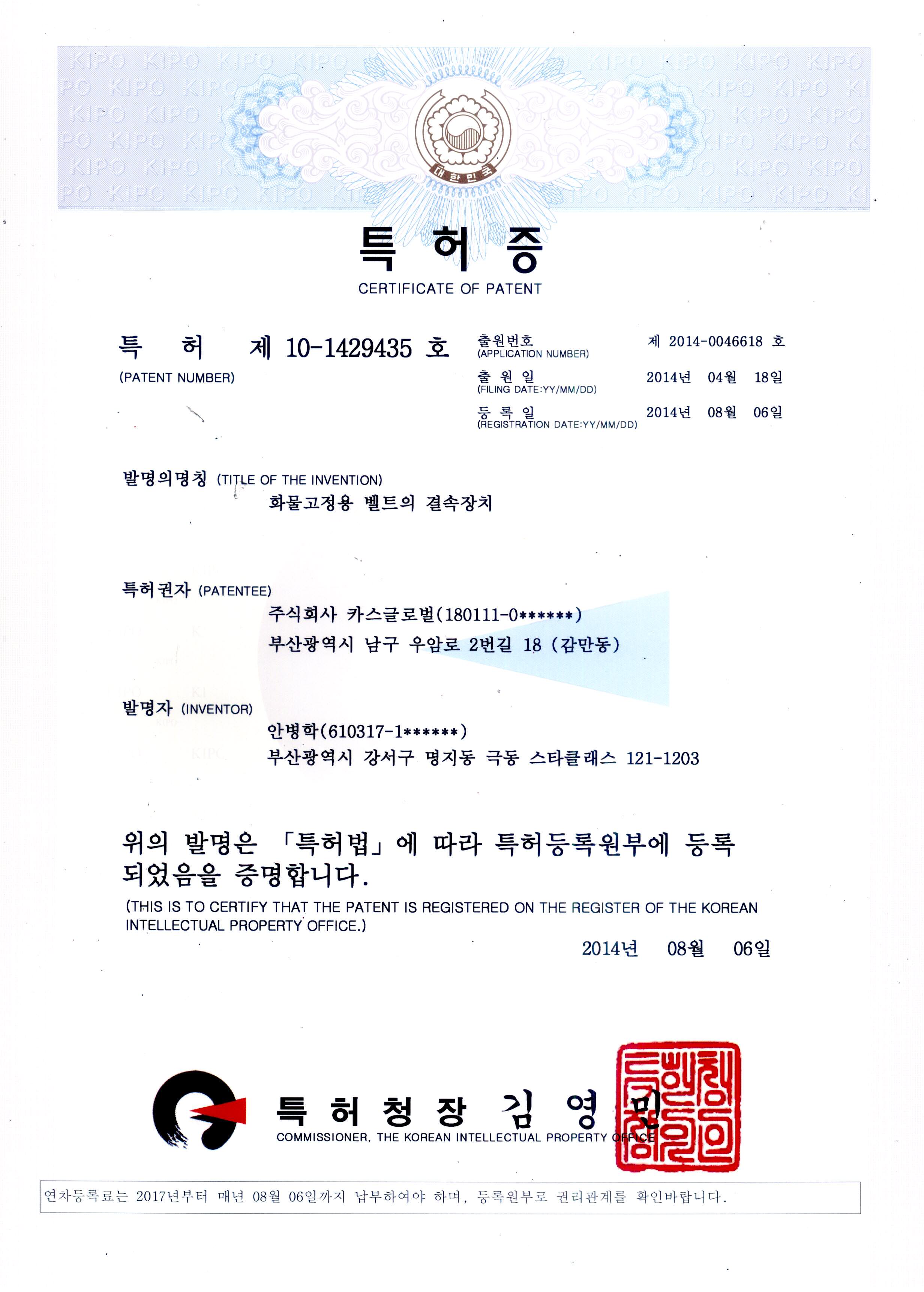 특허 | 화물 고정용 벨트의 결속장치 (특허증)