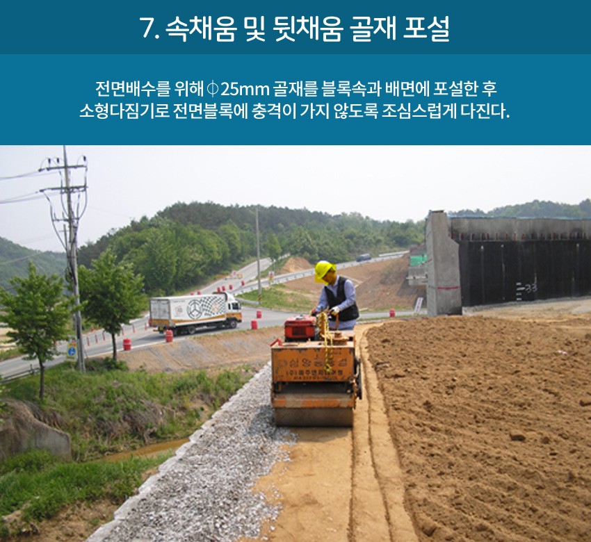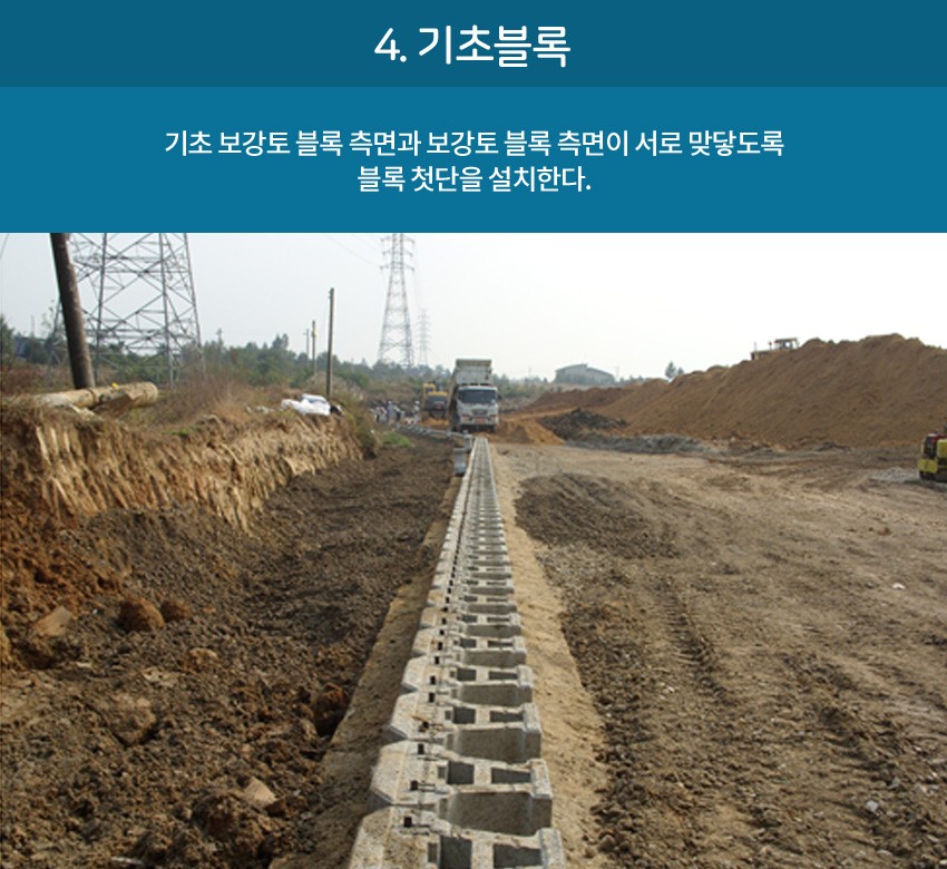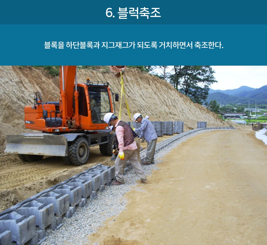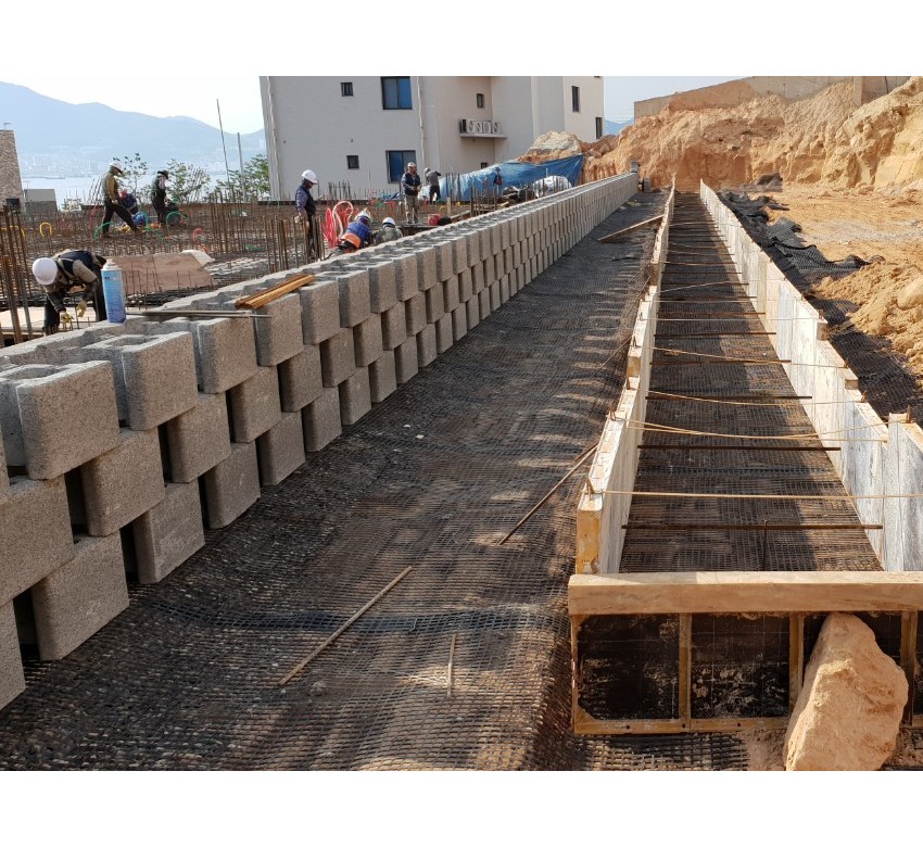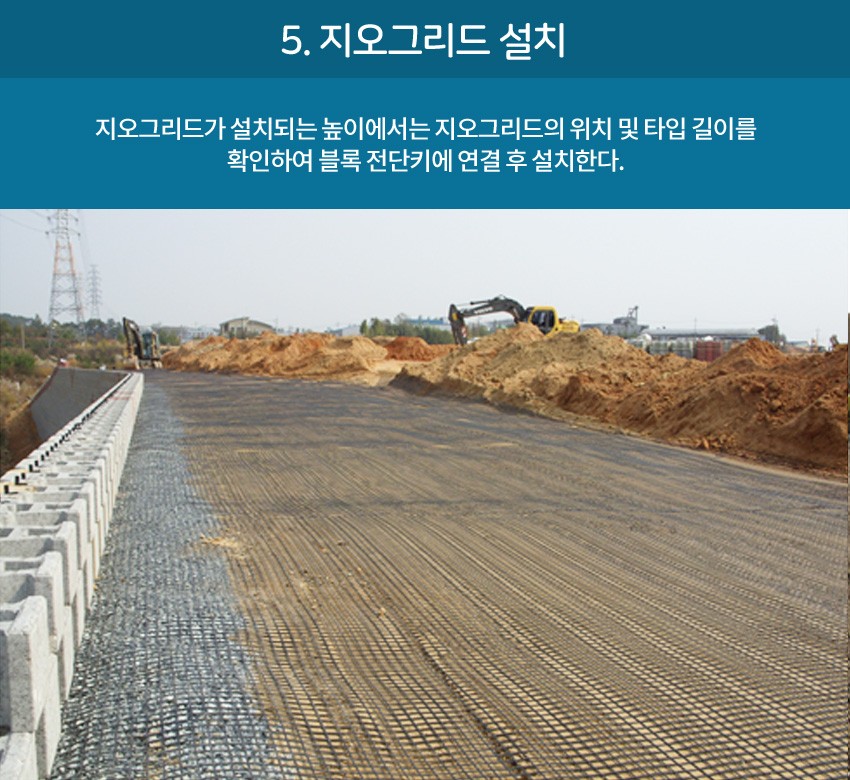 또한 성토흙 사이에 토목용보강재(지오그리드) 토목섬유를 설치하여 성토함으로 보강토블록과 성토흙을 하나로 잡아주는 역할로