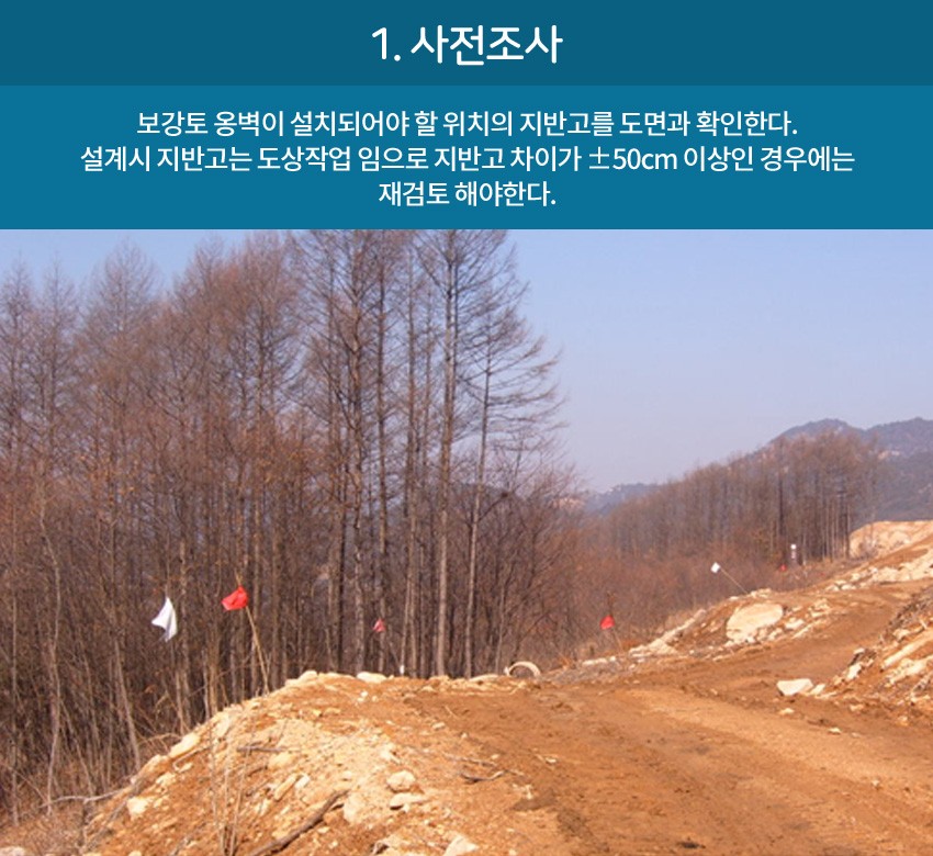 보강토옹벽은 기성제품인 콘크리트블록을 설계된 도면대로 일정한 간격으로 배치하며 성토함으로 옹벽과 같은 지지구조를 형성한다.