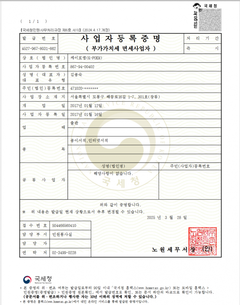 2017.01.12 K-POEM이라는 상호로 종이서적과 인터넷 서적출판 사업자 등록