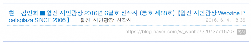 한강의 '흰'은 2016년 5월 25일에 발표된 것으로 나타난다. 김인희의 5시집 『내 사랑, 흰이 돌아온다』 역시 2016년 6월 22일에 출간되었다. 한강작가의 『흰』이 출간될 무렵, 나의 책 출간일도 출판사에서 오늘 내일 하고 있던 참이었으며, 그 때 나의 시 한편 ‘흰’이 웹진 시인광장 6월호 신작시에 발표된다.