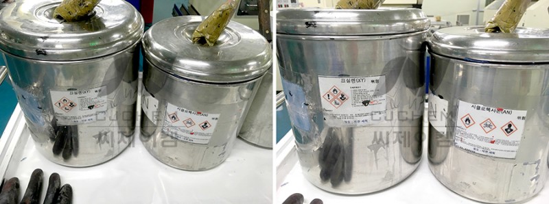 해당 업체는 실크 인쇄를 찍어낸 후 크실렌을 이용해 1차 세척 후 2차로 아농(시클로헥사논)으로 세척을 진행하셨습니다. 각 세척액을 넣은 용기에 천을 충분히 적셔 스크린판과 사용 도구를 닦아내는데 세척은 잘 이루어졌지만 사용 중인 물질들이 유독물질이고 작업자의 건강에 해로울 것 같아 친환경성 제품으로 교체하기 위하여 문의를 주셨습니다.