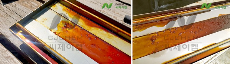 해당 업체에서는 플럭스를 담아두는 기계를 세척해야 하는 상황인데 설비에 들러붙어 있는 플럭스가 어떻게 해도 세척이 잘 되지 않아 저희 씨제이켐에 문의를 주셨습니다.