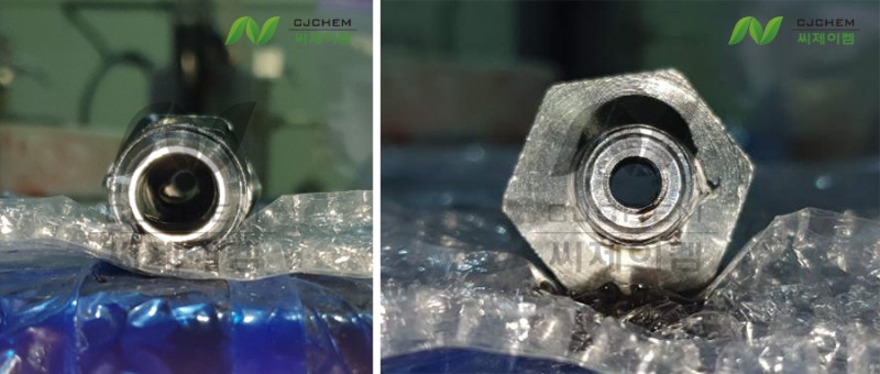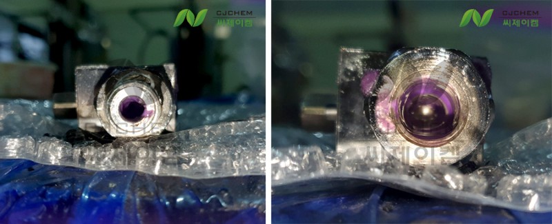 사진에서 보이는 것과 같이 노즐 외부, 내부에 침착된 수지가 경화되어 굳어있는 모습입니다. 특히 내부에서 쌓인 수지는 제거하기도 쉽지 않은데 노즐을 사용하면서 계속 방치하게 되면 점차 수지가 쌓이고 경화되어 분사구가 막혀 노즐이 제 역할을 할 수가 없게 됩니다.