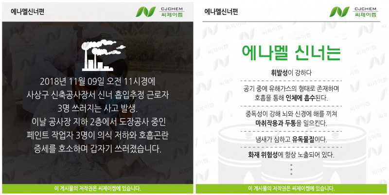 해당 업체는 컴프레셔 제작 업체로 유분 제거를 위해 세척 신나로 불리는 유기용제 에나멜시너로 세척을 해왔으나