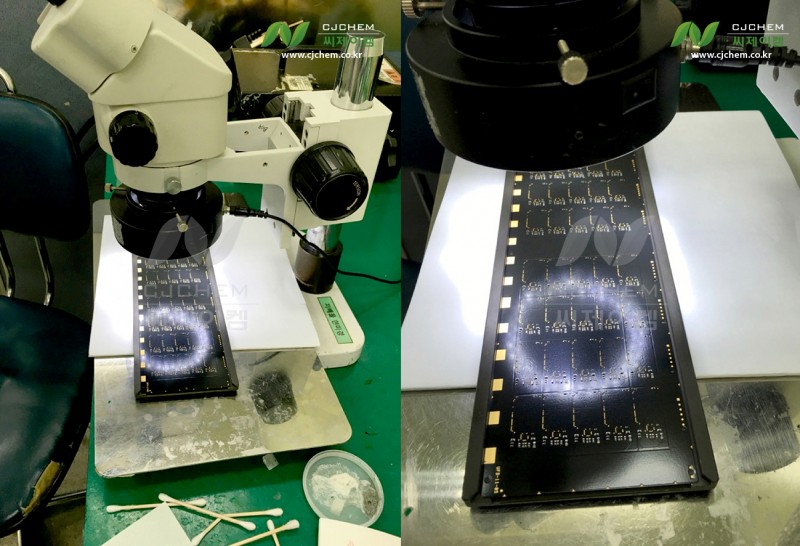 플럭스 세척제로 적용 가능한 BCS 제품으로는 BCS-NEW1000, BCS-3000, BCS-5000 이 있습니다. 제품 각각의 특성이 다르고 또, 업체마다 공정이 다르기 때문에 똑같은 플럭스를 제거하더라도 TEST 결과는 저마다 다르게 나올 수 있습니다. 따라서 저희 씨제이켐이 제품의 TEST를 진행한 후 가장 적합한 제품으로 사용하실 수 있도록 도와드리고 있습니다.
