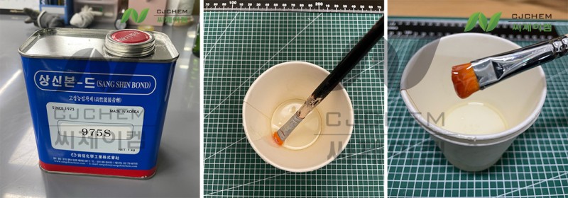 이번에 문의하신 업체에서는 상신본드라는 제품을 붓에 묻혀 사용하셨는데요, 붓이 굳는 것을 방지하기 위해 본드가 묻은 붓을 MEK(메틸에틸케톤)에 용해시켜 관리해왔다고 합니다.