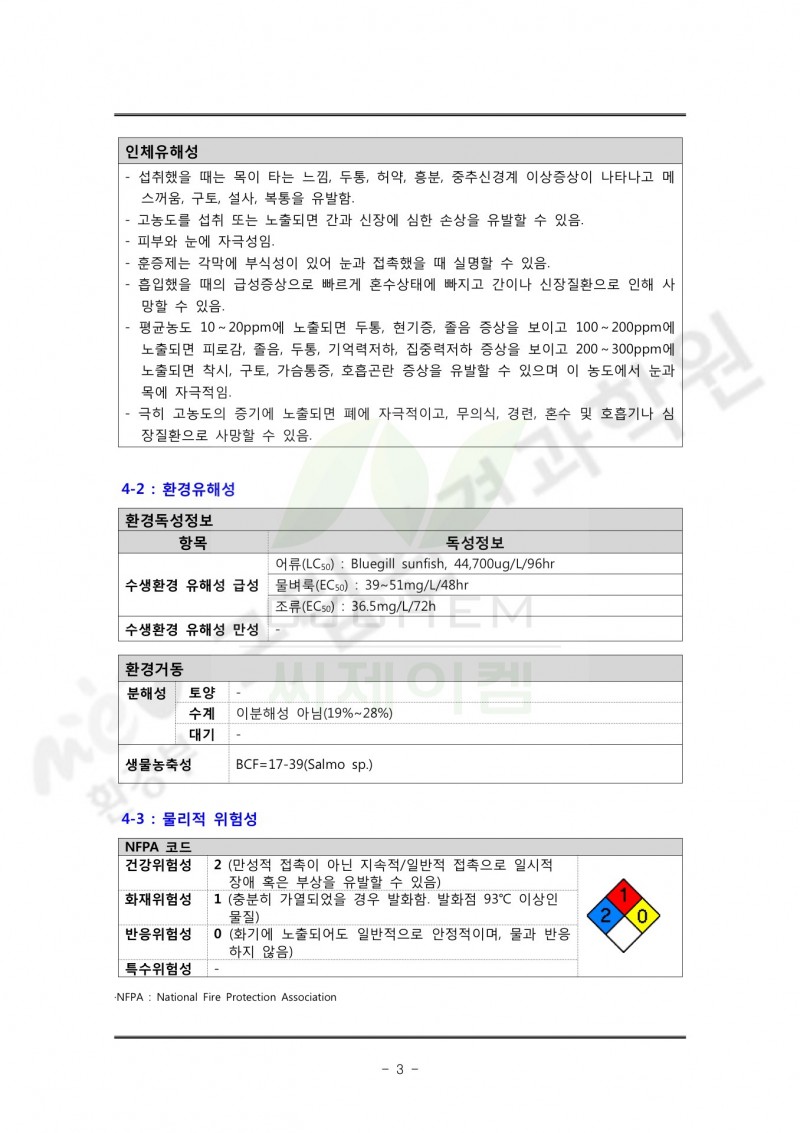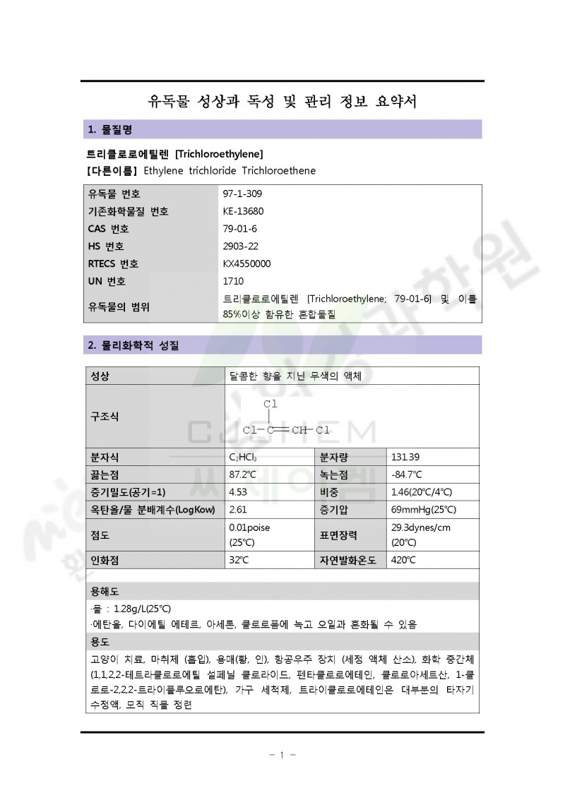 (TCE) 트리클로로에틸렌 유독물 성상과 독성 및 관리 정보 요약서 페이지 정보 작성자 씨제이켐 작성일18-04-06 23:24 조회6,848회 관련링크 이전글 다음글 목록 본문 이전글 다음글 목록