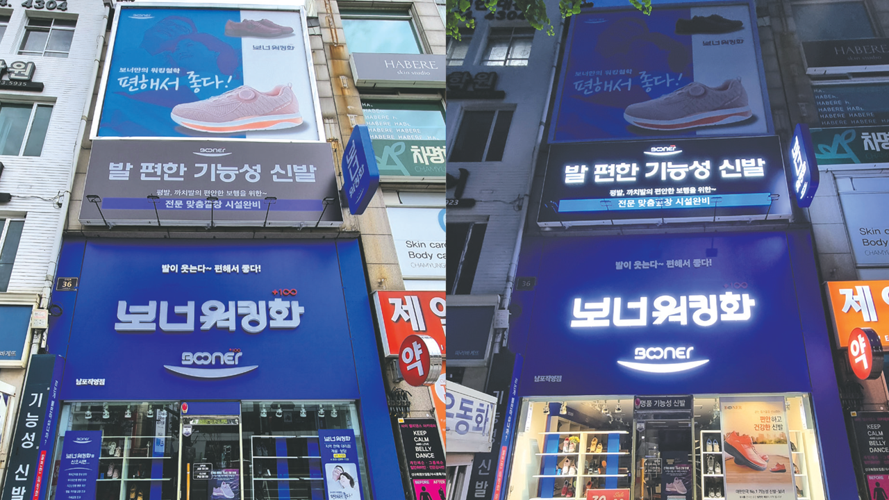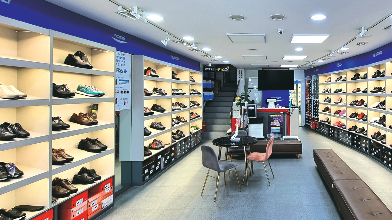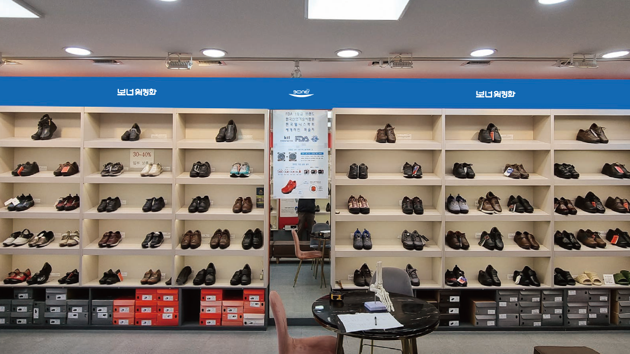 신발 밑창의 모습으로 편안함을 강조하고 사람의 웃는 모습과도 같은 브랜드 아이덴티티를 간직한 보너워킹화만의 인테리어를 만나볼 수 있습니다.